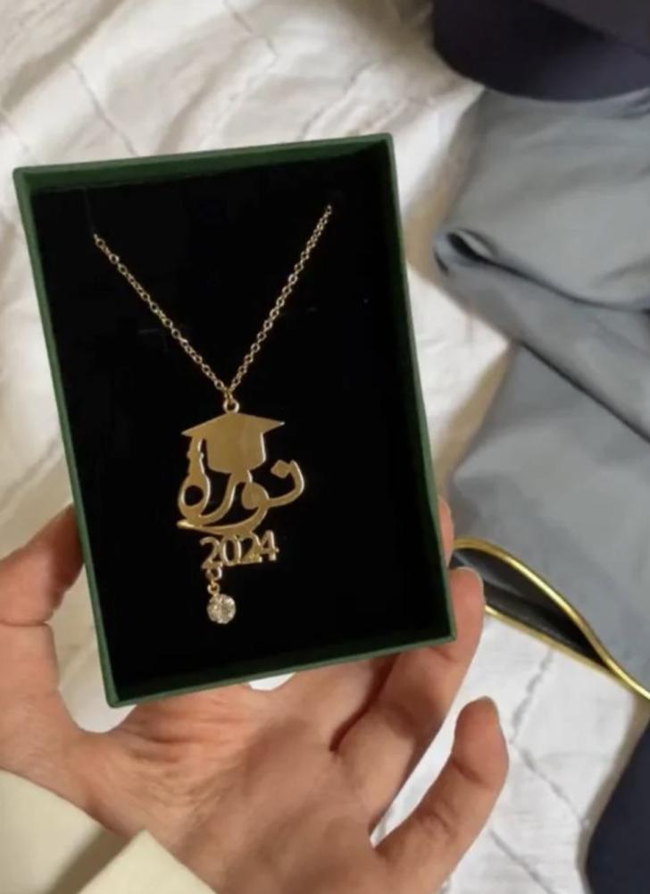 أجمل إهداء للخريجين بالاسم .معلومات المنتج:. مطلي بالذهب عيار 21 قيراط.. إمكانية كتابة الاسم حسب الطلب.. متوفر ذهبي أو فضي.. ضمان سنتين على اللون من أماسي .. ياتيكم بتغليف شيك وجميل