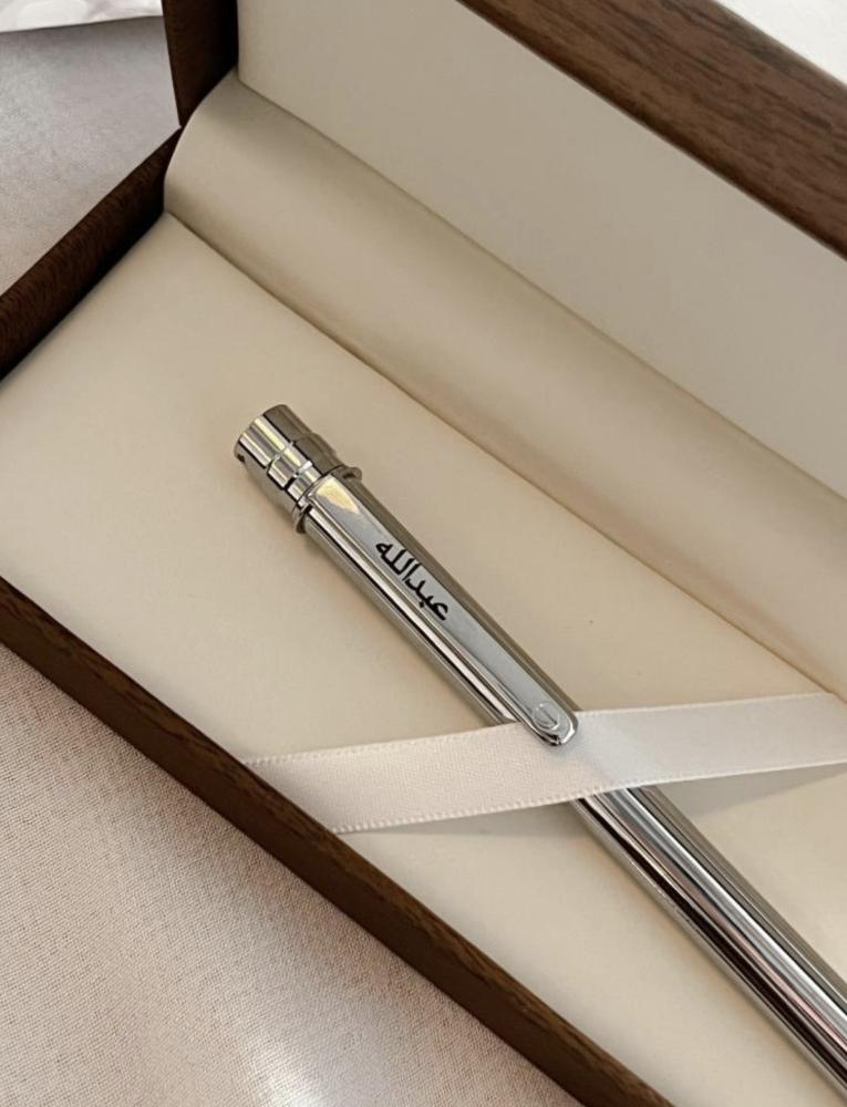 تميّز بأسلوبك الخاص مع قلم راقٍ يحمل اسمك بحفر دقيق ولمسات فاخرة. هذا القلم الأنيق ليس مجرد أداة للكتابة، بل قطعة تعكس شخصيتك وتضيف لمسة من التميز إلى مكتبك أو هداياك الخاصة.